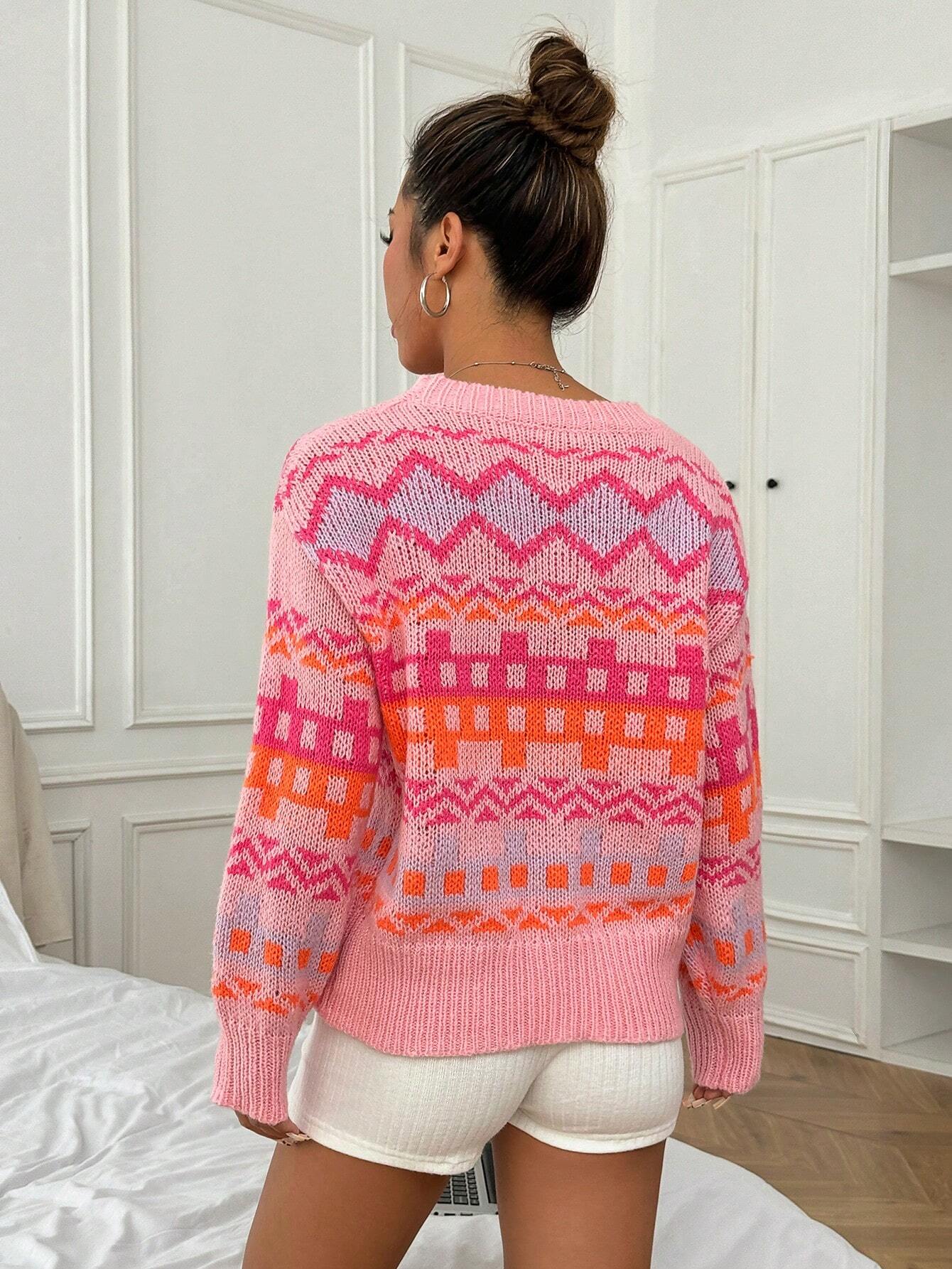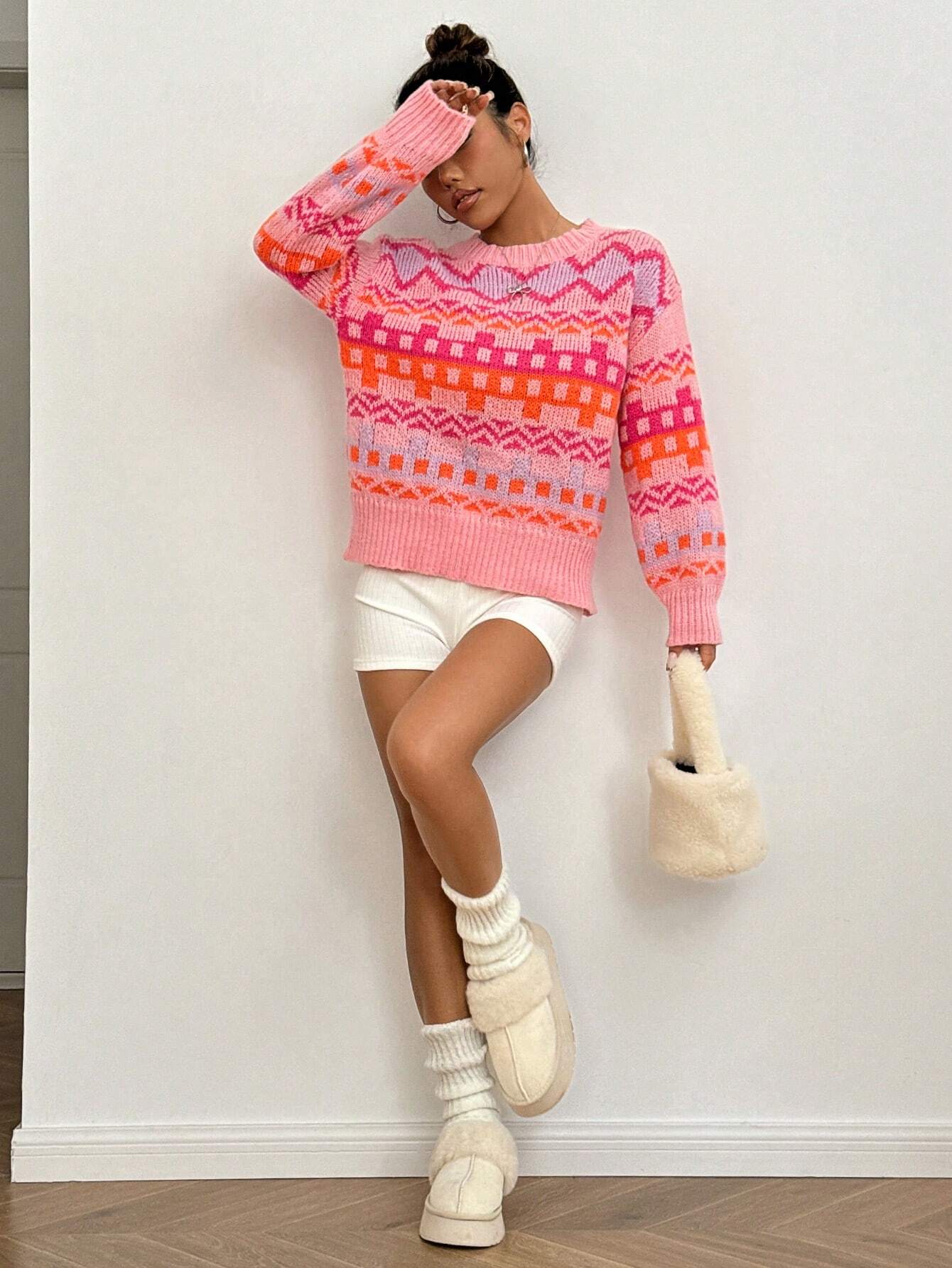Add a splash of color and warmth to your wardrobe with the SHEIN MOOSTA Vibrant Geometric Knit Sweater. This playful sweater combines comfort and style with its geometric patterns, round neckline, and drop-shoulder design. Crafted with a relaxed fit and cozy knit fabric, it's perfect for layering or wearing on its own during late fall and winter. Whether you're lounging at home or heading out, this sweater brings effortless charm to your casual look.
