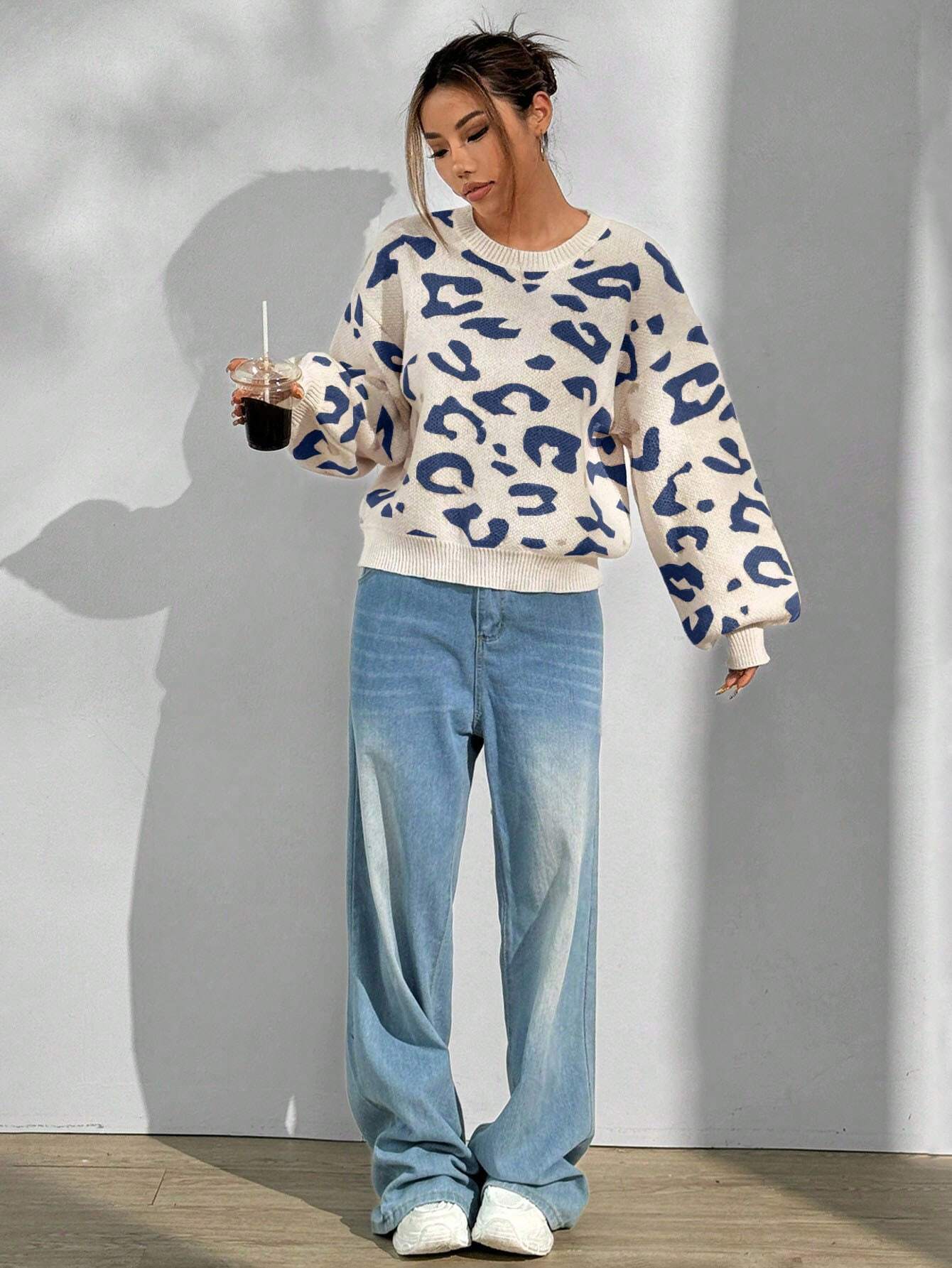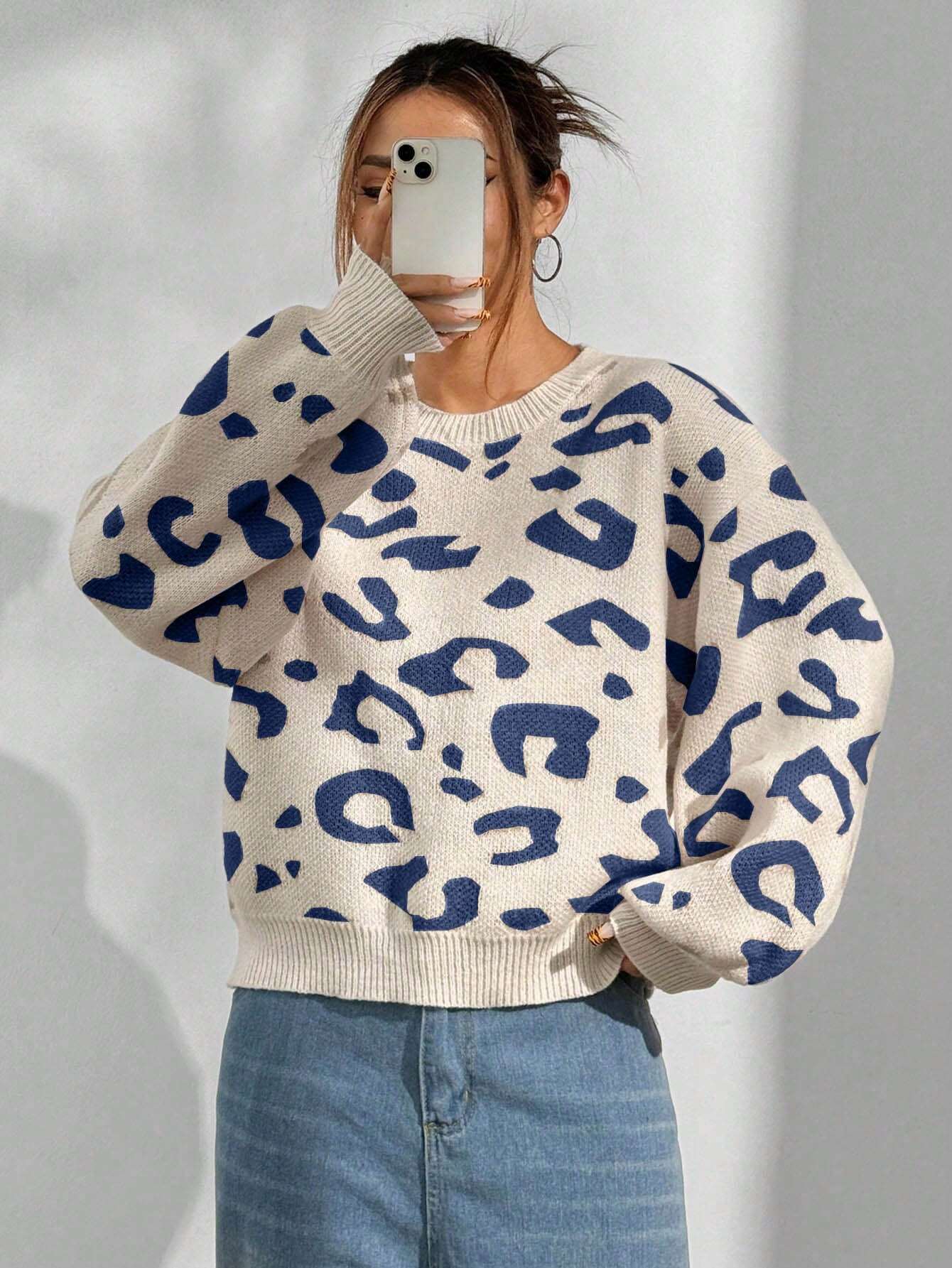 Elevate your wardrobe with the SHEIN Bold Blue Leopard Sweater. Designed with a striking blue and beige leopard pattern, this sweater brings a fresh twist to your casual look. Featuring a round neckline, drop shoulders, and a relaxed fit, it’s crafted from a soft, medium-stretch fabric for ultimate comfort and style. Pair it with your favorite jeans or joggers for an effortlessly chic outfit.