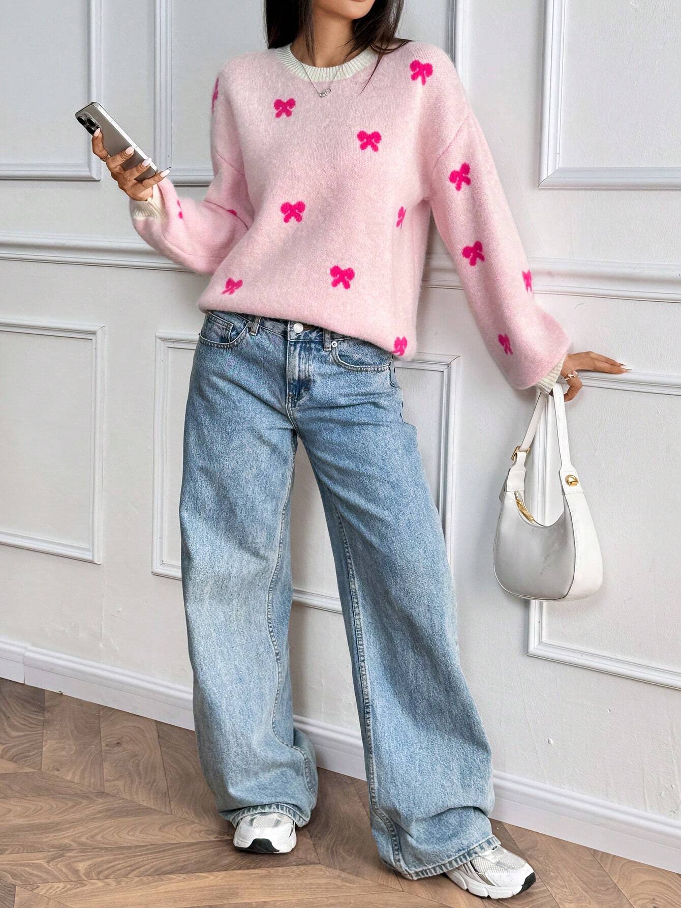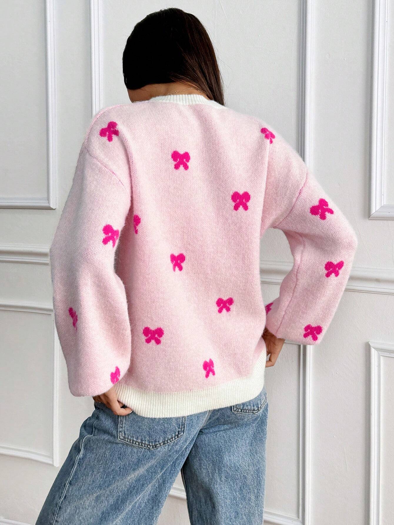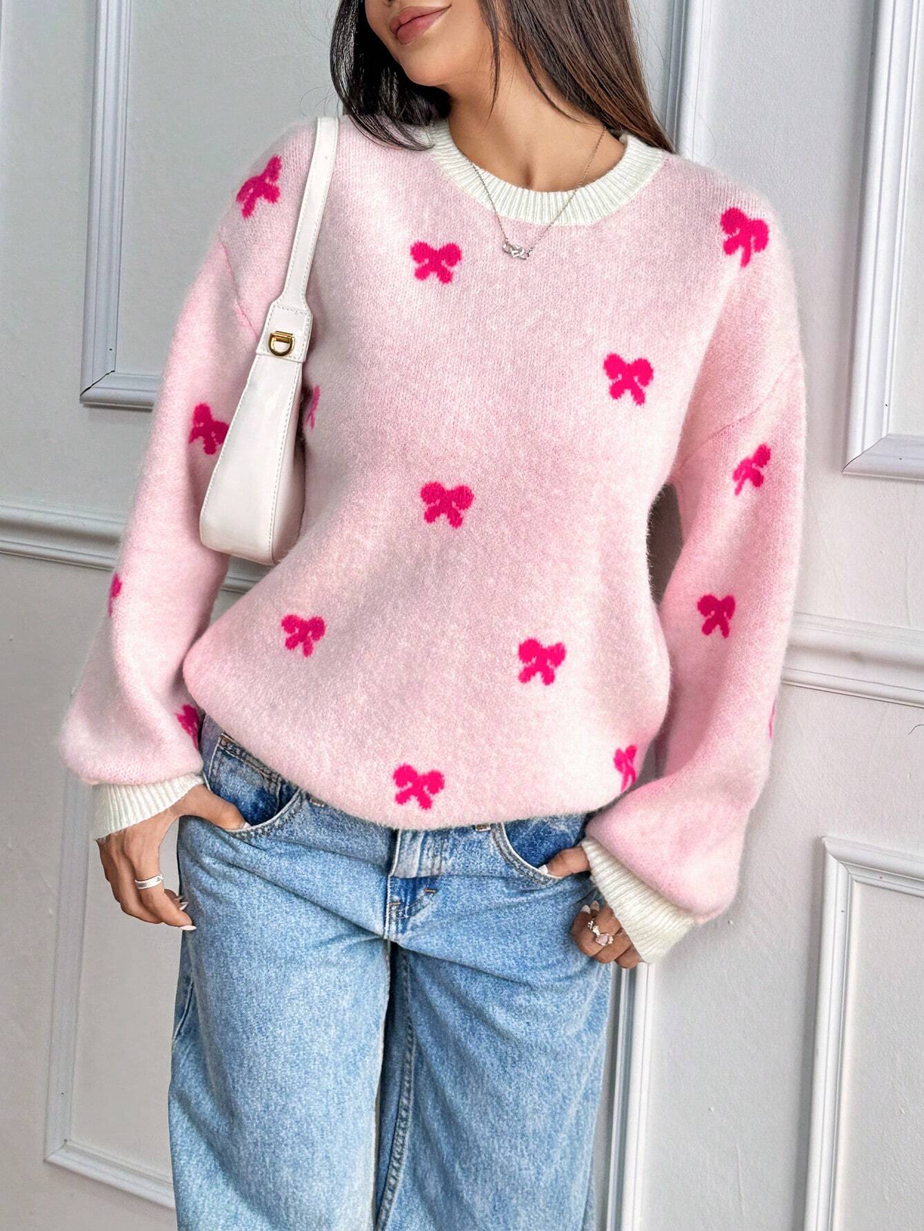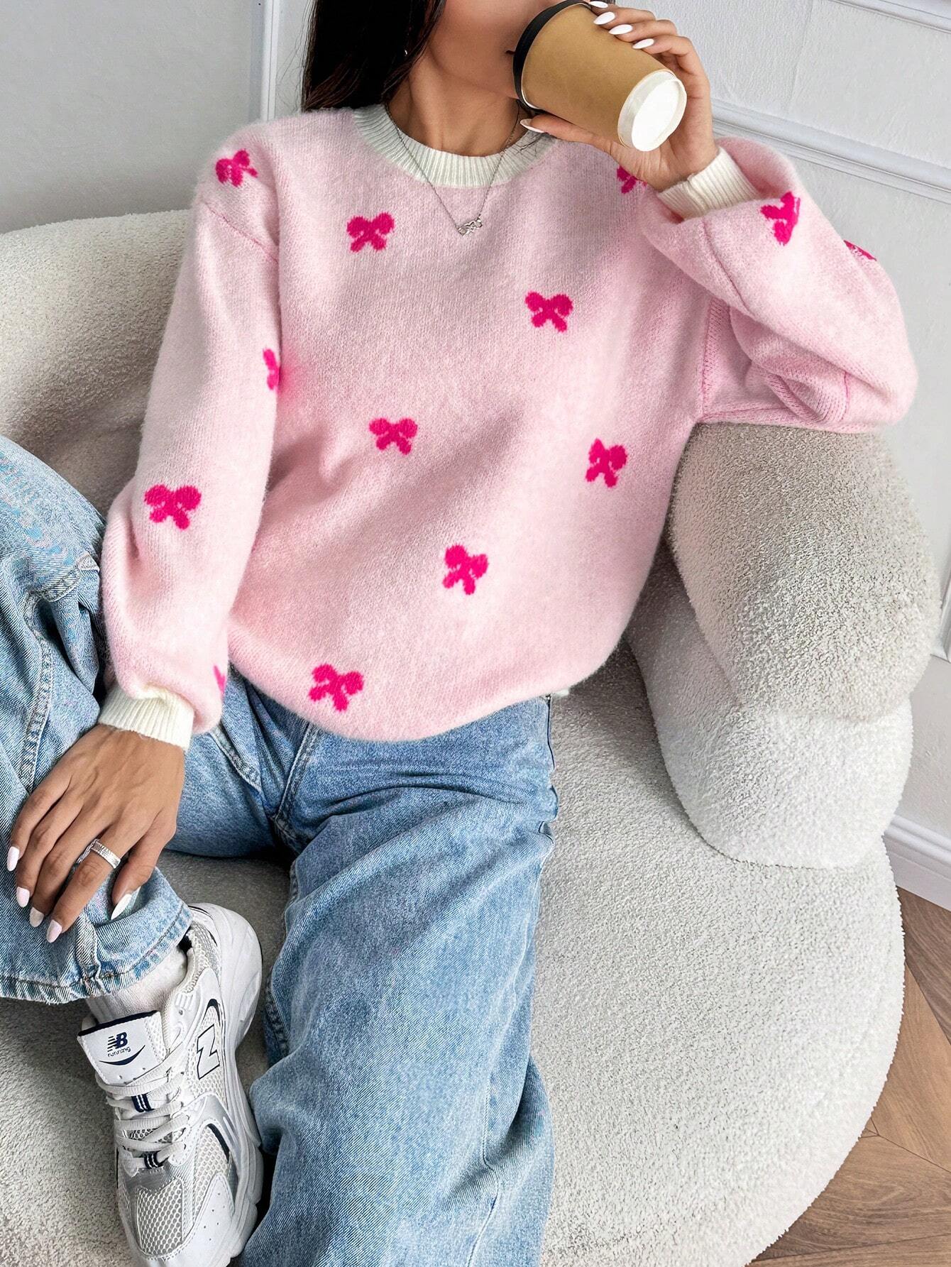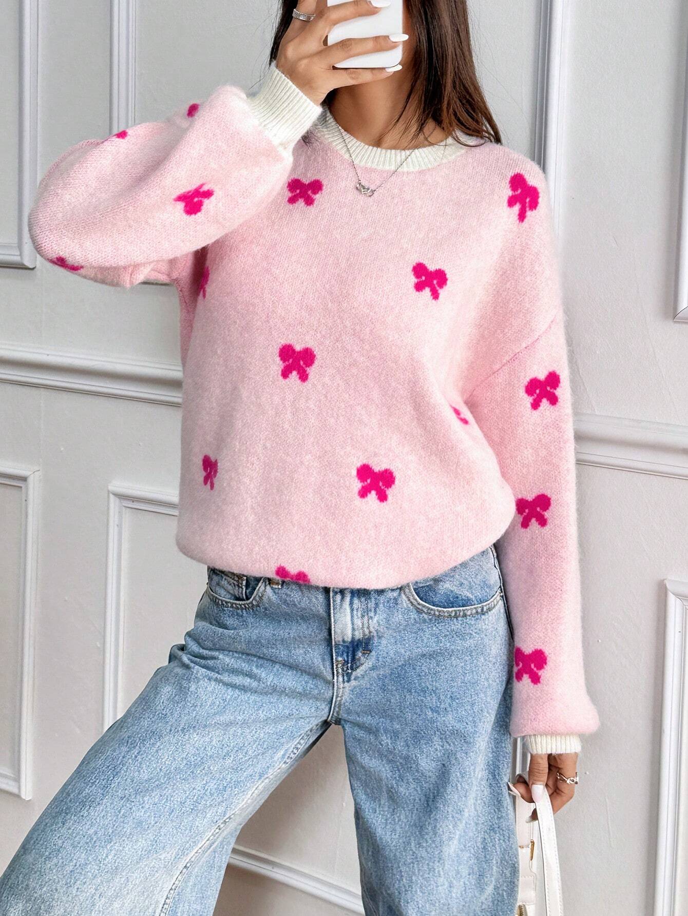 Wrap yourself in cuteness and comfort with the SHEIN Butterfly Jacquard Pink Sweater. Featuring an adorable butterfly pattern, this sweater combines a round neckline and drop-shoulder design for an effortlessly relaxed look. Its cozy knit fabric keeps you warm during chilly days, making it a versatile piece for late fall and winter. Whether you’re heading out for coffee or lounging at home, this sweater is your go-to for casual chic style.