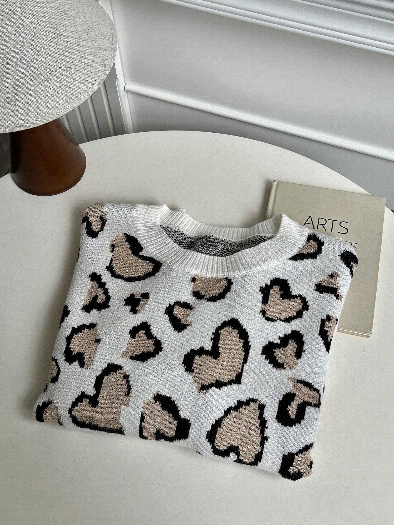 Add some bold charm to your cold-weather wardrobe with the SHEIN Leopard Heart Knit Sweater. This eye-catching pullover features a unique leopard heart pattern, rib-knit trim, and a relaxed fit for ultimate comfort. Perfect for layering, it’s the ideal choice for cozy fall and winter days.