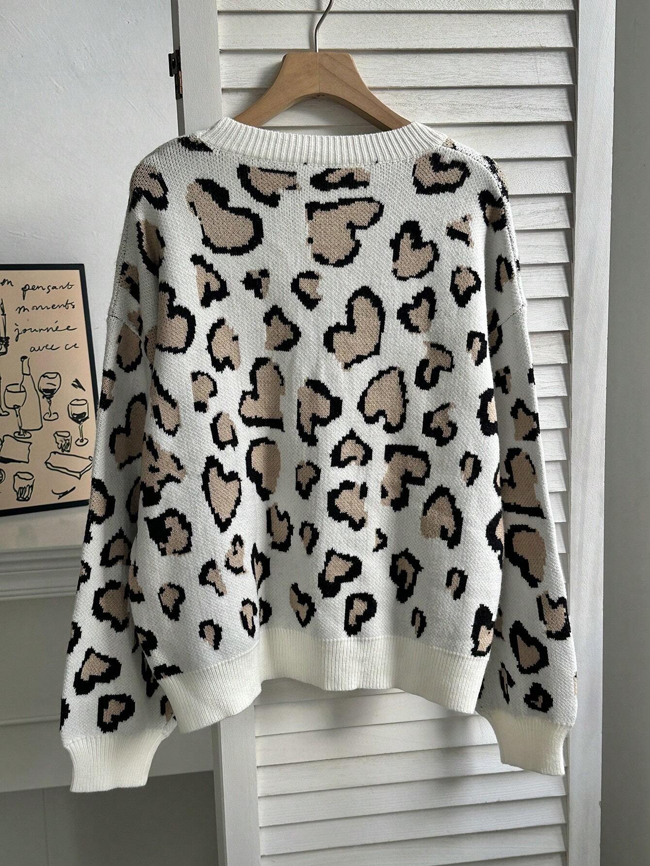 Stay warm in style! 🐆💖 Shop the Leopard Heart Knit Sweater today and make a bold fashion statement!