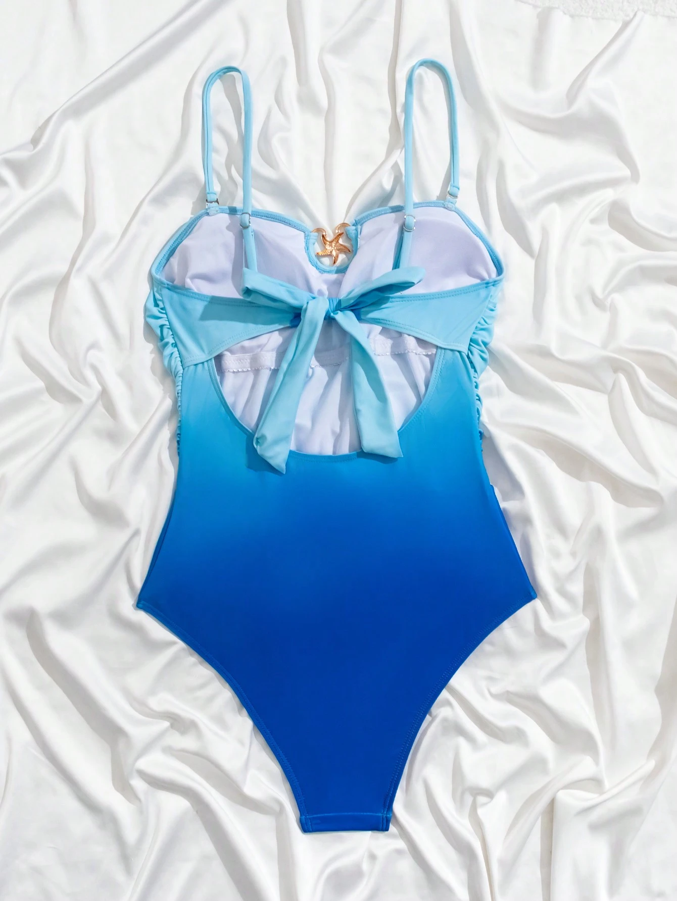Feel the waves in the Ocean Breeze Ombre Swimsuit – where elegance meets beachy flair. Designed with a flattering ruched bodice, soft-to-the-touch gradient blue shades, and a dazzling metallic starfish centerpiece, this bandeau-style one-piece is your go-to for unforgettable vacations. The back tie and wireless cup offer comfort and support, while the lined interior ensures a secure fit. Whether lounging by the pool or strolling the shore, this suit guarantees compliments.